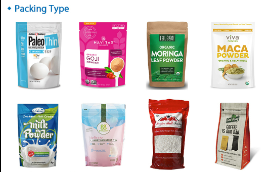 Denna färdigtillverkade påsfyllnings- och förseglingsmaskin som består av 8 arbetsstationer för effektivitet och stabilitet, framhäver paketet med stående väska, dragkedja, pipväska och olika förgjorda påsar. Samarbetade med skruvskruv och automatiska lyfttransportörer, appliceras den på pulver material.