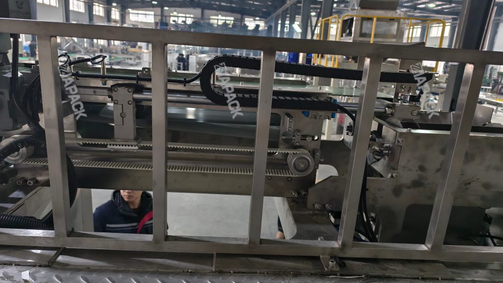 Horizontal conveyor belt for collecting the finished sachets → slope arrangement conveyor will make the sachets flat before counting → Acceleration belt conveyor will make the adjacent sachets leaving enough distance for counting → counting and arranging machine will arrange the small sachets as requirement → the small sachets will load into the bagging machine → bagging machine seal and cut the big bag → belt conveyor will take the big bag under the packaging machine.