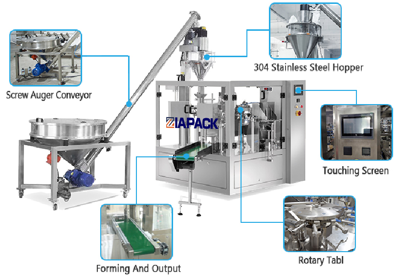 Denna maskin kan automatiskt ta påsen, öppna påsen, fylla materialet och försegla påsen. Används ofta för att förpacka olika pulvermaterial.