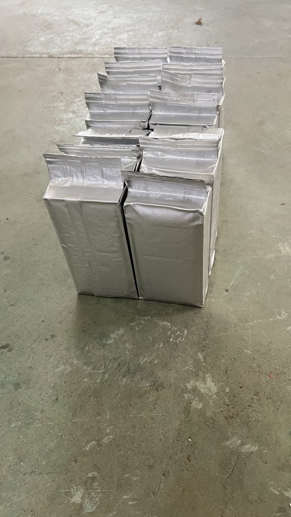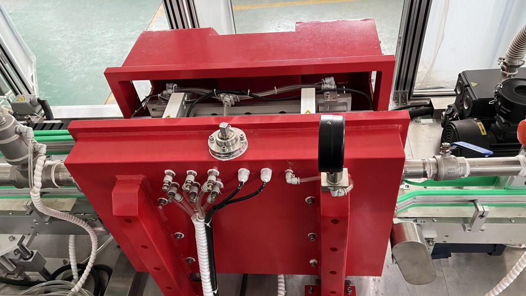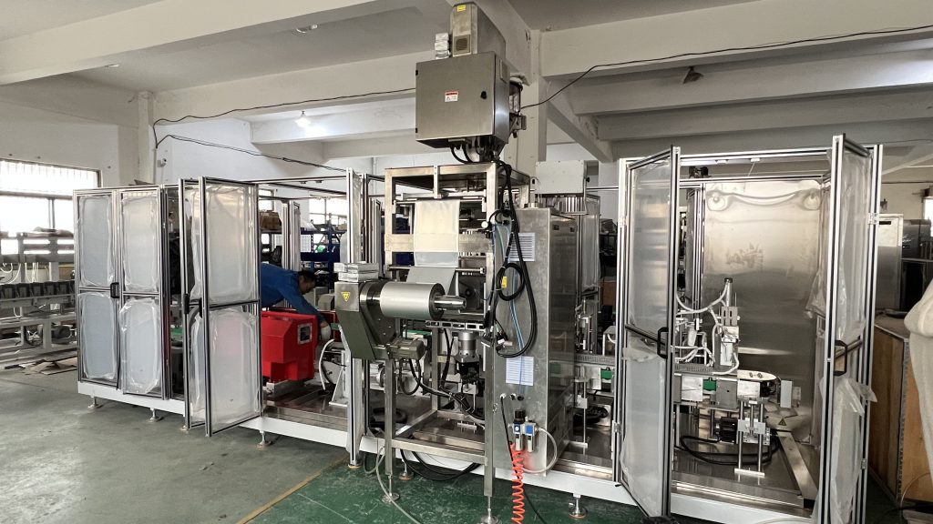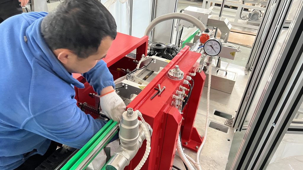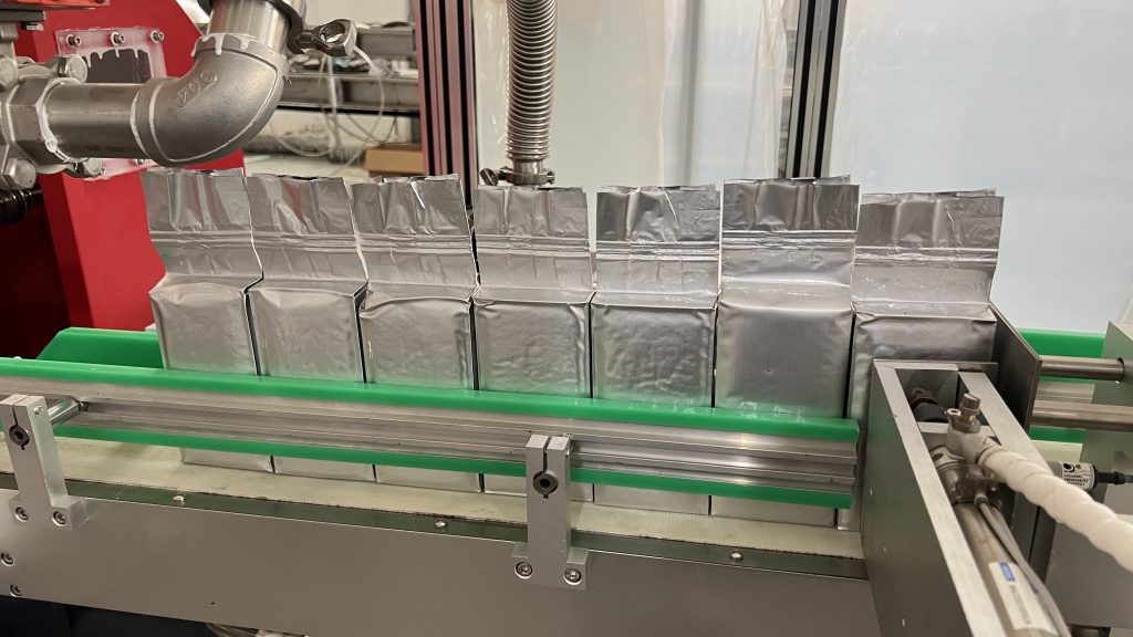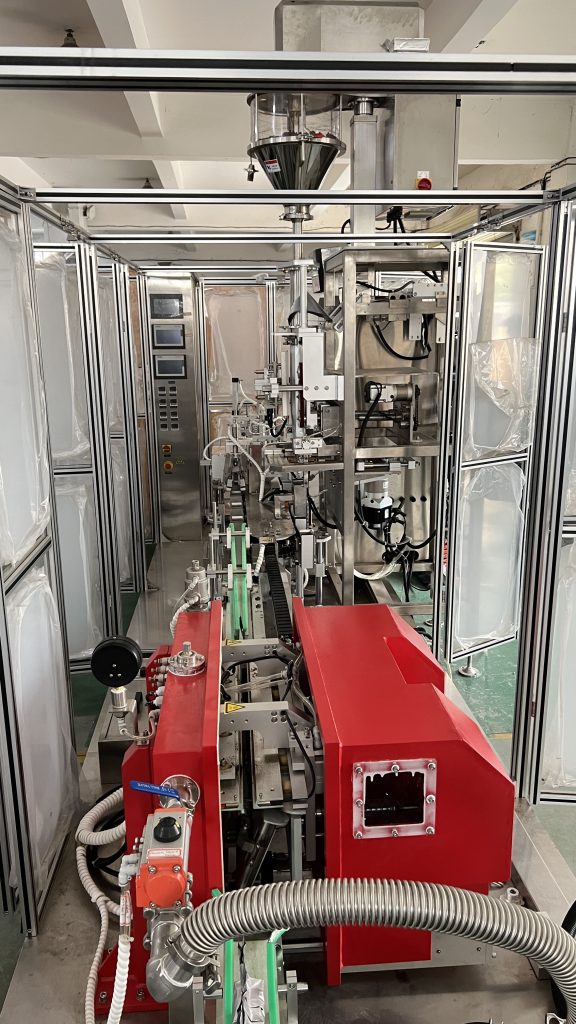 Vår kund från Iran hade beställt en uppsättning automatisk tegelvakuumpåsformande fyllningsförpackningsmaskin för 250 gram kaffepulver. Och följ kundens krav vi hade målat vakuumkammaren till röd färg som varning.