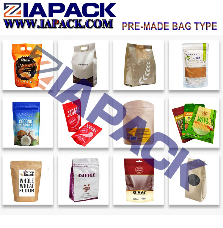Bred applikation för packningslösning för vävfyllning för premade pouch för olika ris, frön, foder, bönor, socker, popcorn, chips, nötter, sällskapsdjur, te- och metall- eller plastdelar, automatisk materialmatning, vägtullförseglingsfunktion etc.
